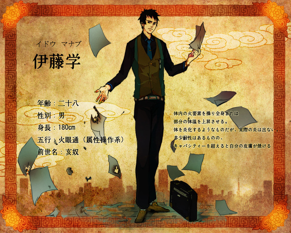イドウマナブ■議員の公設秘書。成金一族生まれボンボン。表面は友好的だが本性は頭の悪い者や社会地位が無い者が大嫌いで、今回の夢は選ばれなかった劣勢者を一掃する天の意思だと思い込んでいる。腐った世界を塗り替えて新世界の神に以下略。常に見下す姿勢■「情に溺れる様が愚か」と前世【亥奴】は否定しているが、夢は毎日見る。その度性格操作されている様な錯覚を起こし嫌悪感を大きく抱いている。【能力】焼きゴテ人間。温度/時間の限度は100度/5分から反比例。超えると自分の体に支障がでる