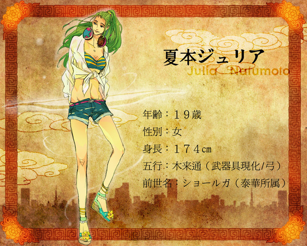 蓬莱人とブラジル人のハーフ。明るく活発で人懐こい。純粋だが海外育ちと分かるくらいには大胆。世界を点々とし、今は羽泉にある大学に通学中。写真を撮るのが好きで特に草原を被写体にするのを好む■小さい頃から見る前世【ショールガ】の夢を全部信じている上、自分は夢の中の子の換生者だとすっかり思い込んでいる。幼いころからその話を周りに普通にするので、よく変な子と言われてきたが別に気にしていない■両親と別れたところで夢が途絶えており、悲しむ夢の自分を助けてあげたいと転生した父と母、同国の同胞達を捜し続けている。■【能力】弓矢を具現化する。ただし命中率は…。「こういうものは、数打ちゃ当たるよ!」